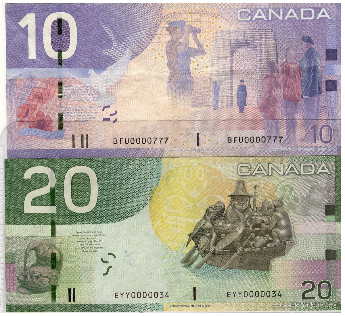 2009 $10 BFU0000777 & 2005 $20 #EYY0000034. Lot of 2 low serial numbered notes VF-EF.