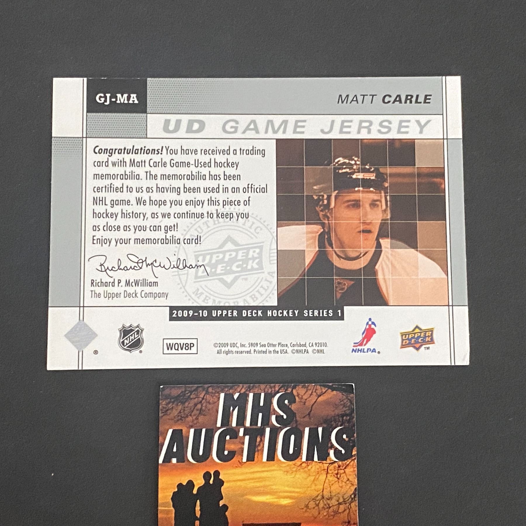 2009-10 U.D HOCKEY SERIES 1 MATT CARLE N.H.L JERSEY CARD