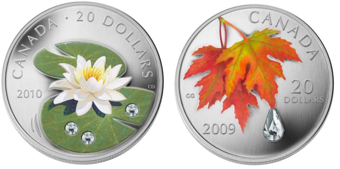 2009 $20 Autumn Showers Crystal & 2010 $20 Water Lily - Lot of 2 Pure Silver Coins. Tax Exempt.
