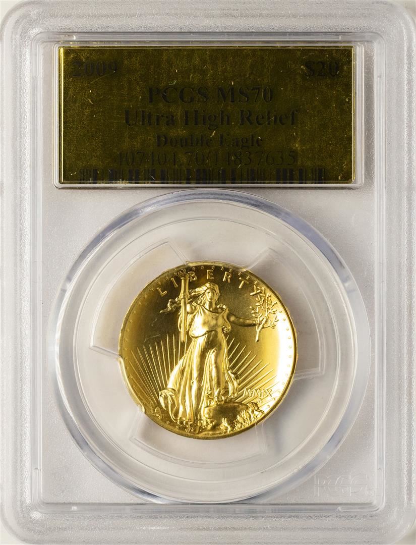 One 2009 $20 Ultra High Relief Double Eagle Gold Coin PCGS MS70 Gold Foil Label. PCGS Graded.