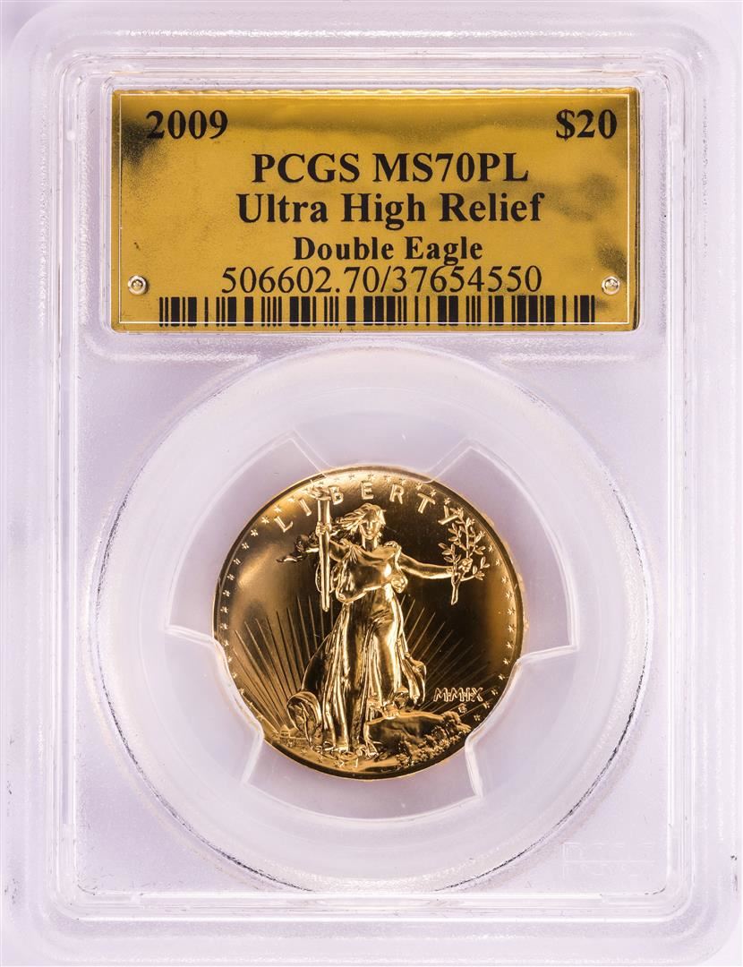 One 2009 $20 Ultra High Relief Double Eagle Gold Coin PCGS MS70PL Gold Foil Label. PCGS Graded.