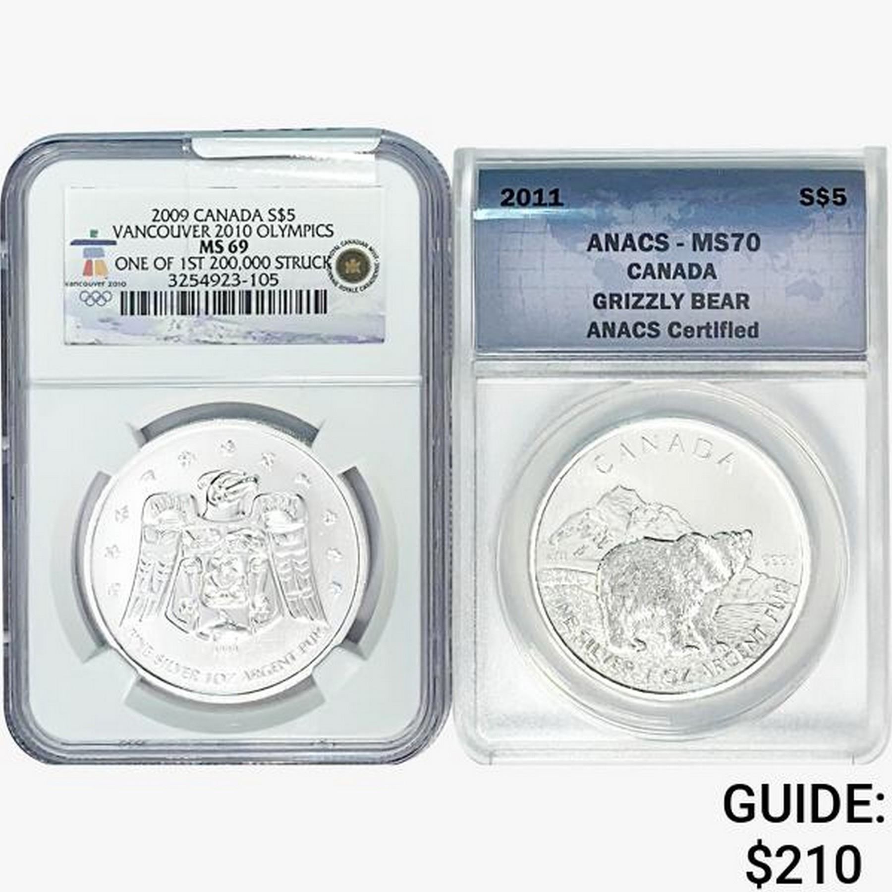 2009&2011 [2] 2oz. SILV. Canadian $5 ANACS/NGC MS6