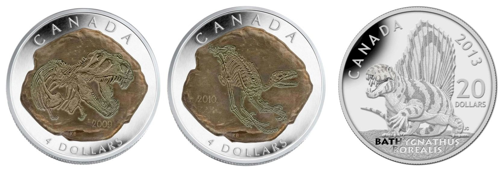 2009 $4 Dinosaur Collection: Tyrannosaurus Rex, 2010 $4 Dromaeosaurus & 2013 $20 Dinosaurs of Canada: Bathygnathus Borealis - L