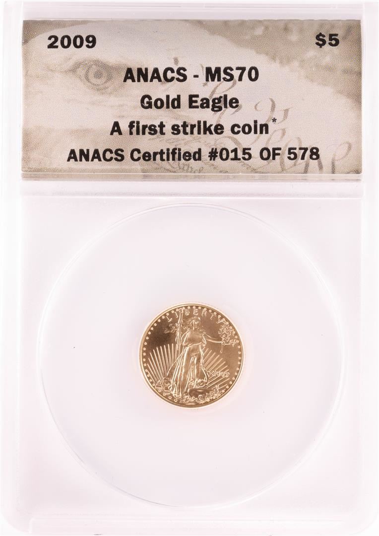 One 2009 $5 American Gold Eagle Coin ANACS MS70 First Strike. ANACS Certified.