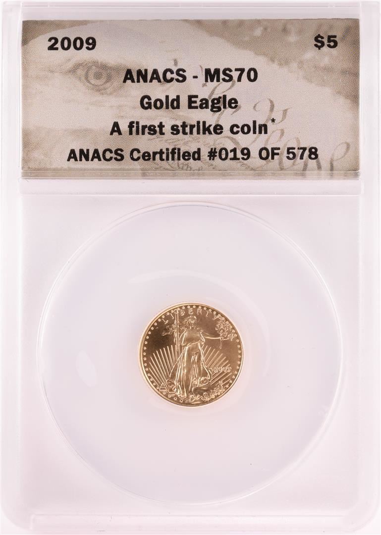 One 2009 $5 American Gold Eagle Coin ANACS MS70 First Strike. ANACS Certified.