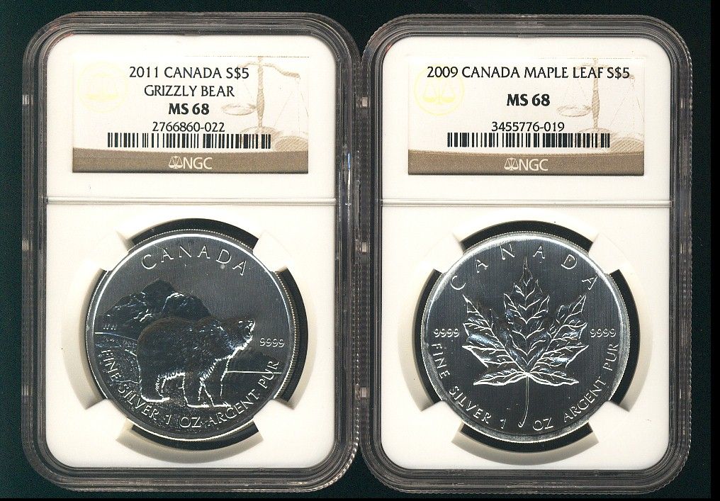 2009 $5 SML & 2011 SML Grizzly Bear NGC MS68. Lot of 2 coins.