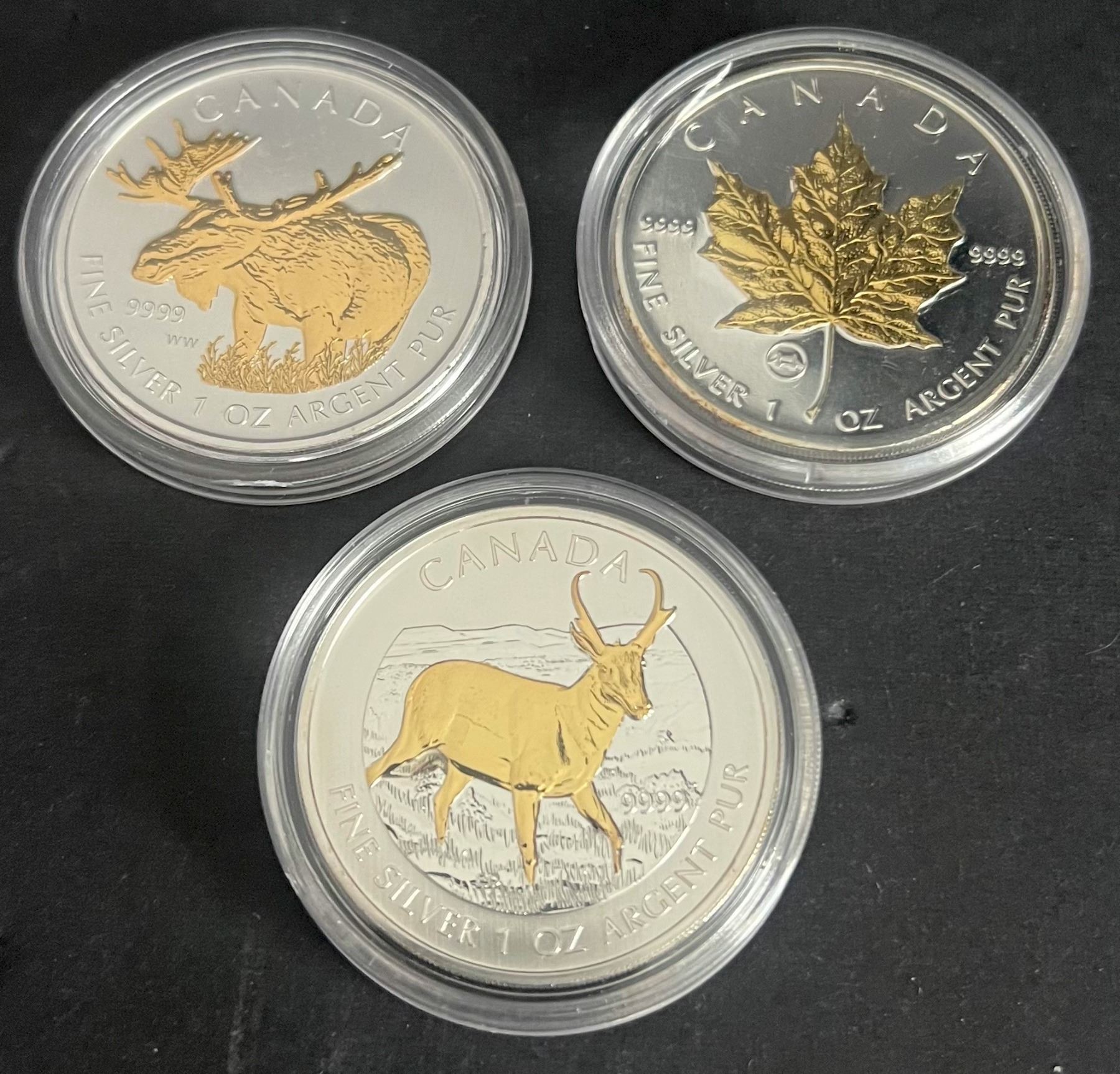 2009 $5 Silver Maple Leaf Tower Bridge Gold Plated, 2013 $5 Antelope Gold Plated, and 2013 $5 Majestic Moose, lot of 3 coins.