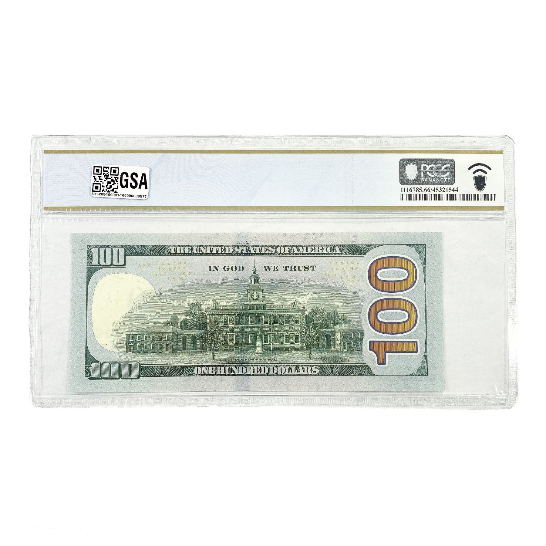 f. Notes sold referencing a third-party grading service are sold “AS IS” without any express or implied warranty, except for guarantee by GSA that they are genuine. Grading, condition or other attributes of any Product may have a material effect on its value and the opinion of others, including third-party grading services such as PCGS Currency and PMG may differ with that of GSA. GSA shall not be bound by any prior or subsequent opinion, determination, or certification by any grading service. Bidders specifically waive any claim to right of return of any Product because of the opinion, determination, or certification, or lack thereof, by any grading service. Certain warranties may be available from the grading services and Bidders are referred to them for further details: Paper Money Guaranty (PMG), PO Box 4711, Sarasota, FL 34230; PCGS Currency, PO Box 10470, Peoria, IL 61612-0470; PCGS Gold Shield, PO Box 9458, Newport Beach, CA 92658. Third-party graded notes are not returnable for any reason whatsoever.