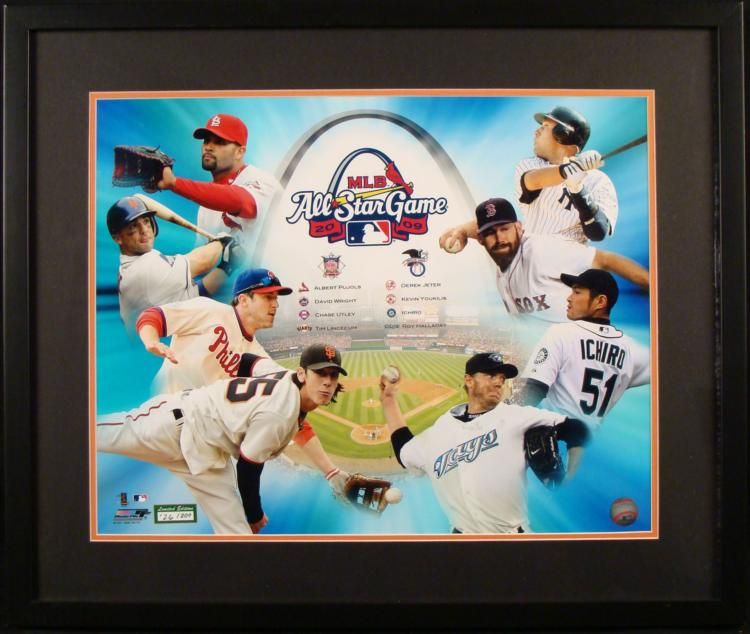 In 2009, St. Louis was the lucky city to host the All-Star game. Offered here is a 21 1/2" x 25 1/2" framed, orange and black matted, photographic collage of the some of the headline players who competed in the 2009 All-Star game. Such names are Tim Lincecum, David Wright, Kevin Youkilis, Roy Halladay, and more. The players are either fielding a routine grounder, throwing a wicked strike, or swinging for the fences. The photograph is of a limited edition, 26/209, has a MLB hologram at the bottom right, and is in mint condition. There is a wire on the back of the frame, that comes with a hook and nail for hanging.