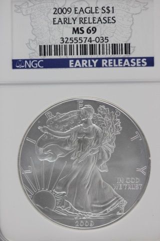 This wonderful coin is a 2009 American Silver Eagle. This an early release and has been graded MS 69 by NGC. This coin is made of .999 pure silver and would make a fantastic addition to any collection.