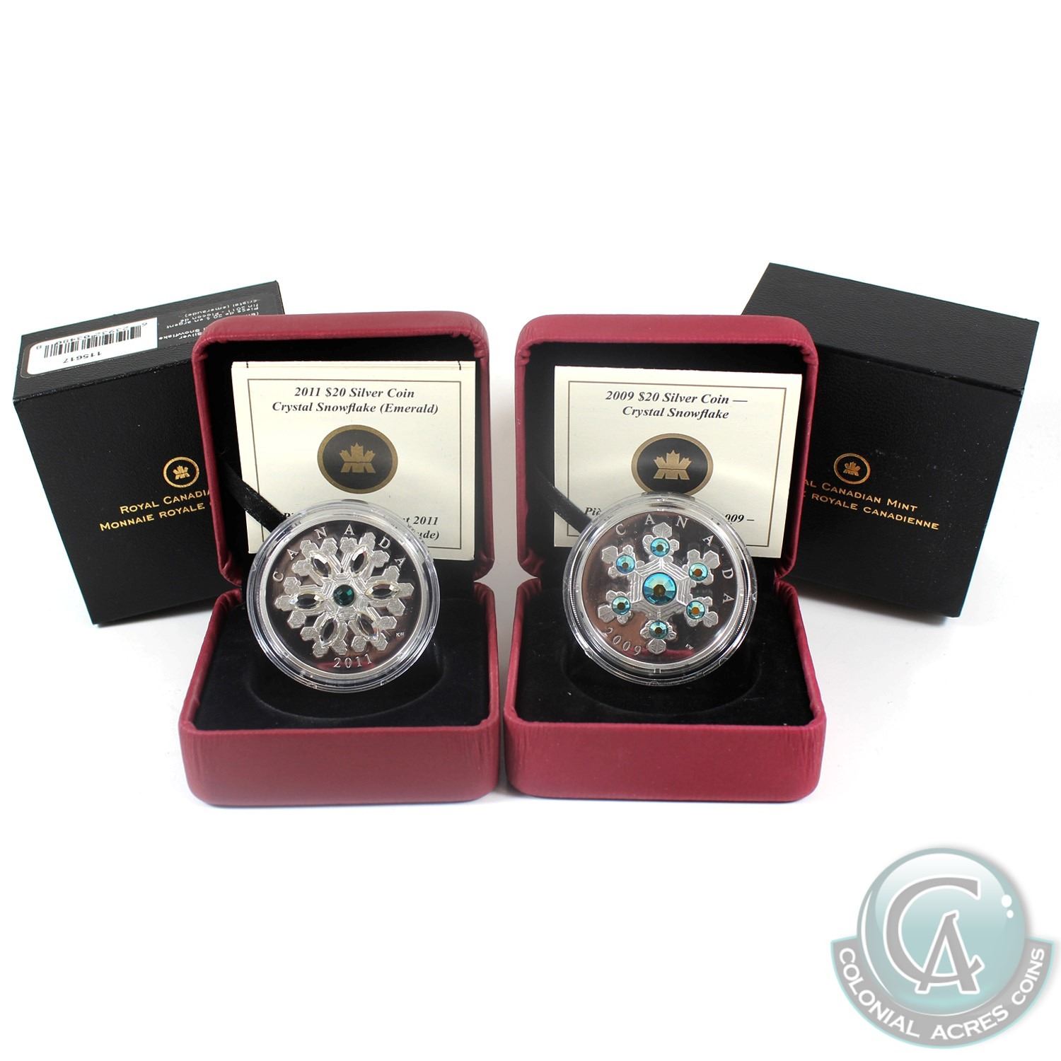 2009 Canada $20 Blue Crystal Snowflake & 2011 $20 Emerald Crystal Snowflake Fine Silver Coins (2011 capsule lightly scratched). 2pcs (TAX Exempt)