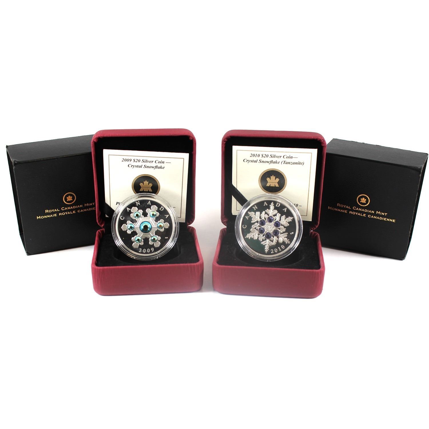 2009 Canada $20 Blue Snowflake & 2010 Canada $20 Tanzanite Crystal Snowflake Fine Silver Coins (TAX Exempt). Tanzanite has a lightly scratched capsule. 2pcs.