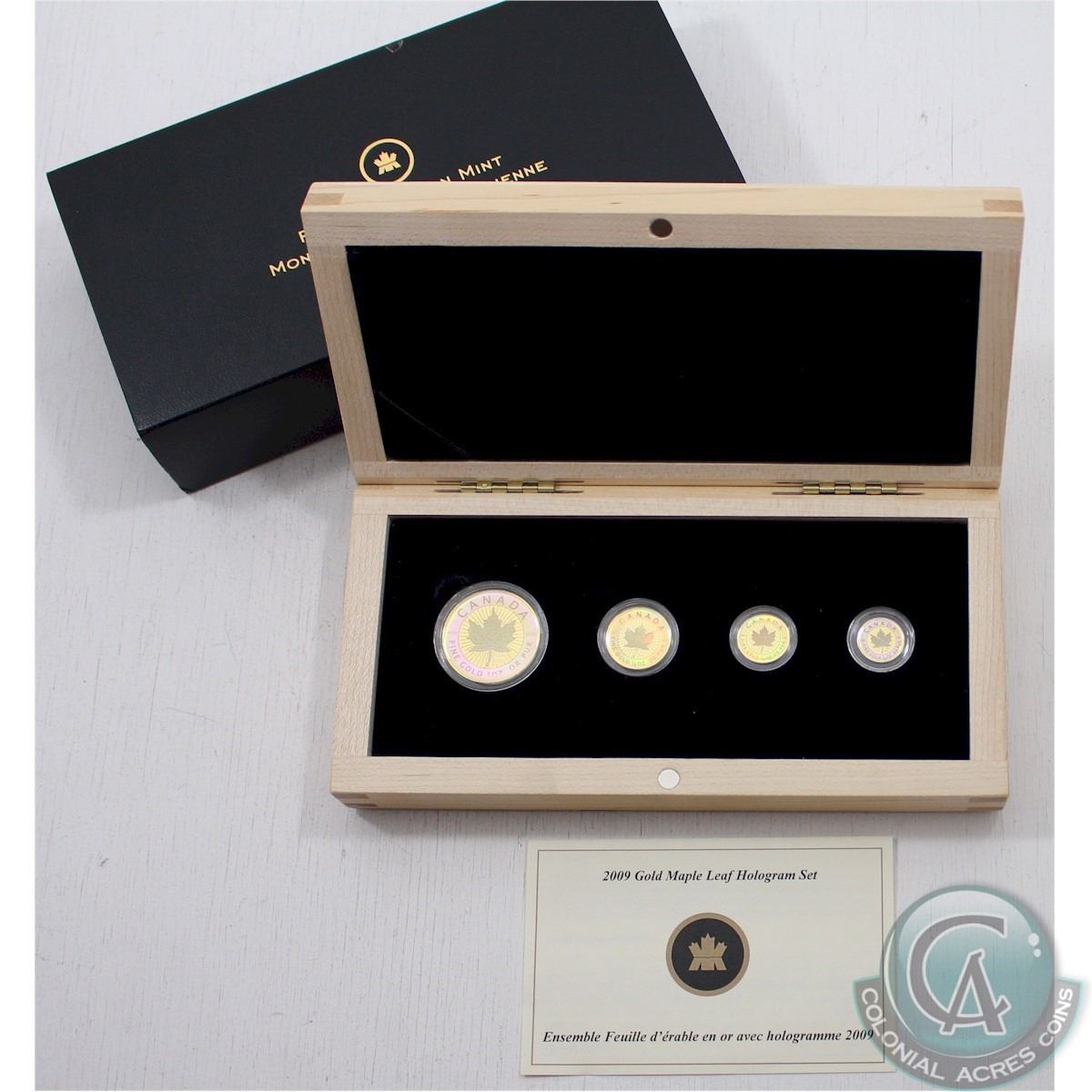 2009 Canada 30th Anniversary Fractional Gold Maple Leaf 4-coin hologram set. Contains 1oz, 1/4oz, 1/