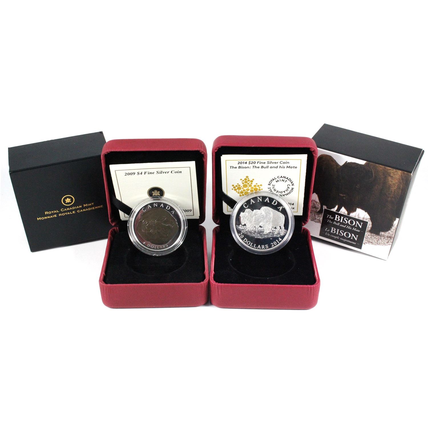2009 Canada $4 Dinosaur Collection - Tyrannosaurus Rex & 2014 $20 The Bison - The Bull and His Mate Fine Silver Coins (2009 capsule is cracked). 2pcs (TAX Exempt)