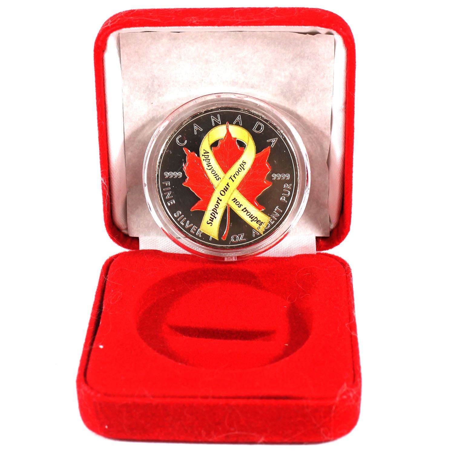 2009 Canada $5 Coloured 'Supporting our Troops' 1oz Fine Silver Maple (Tax Exempt) Coin comes encapsulated with COA and red velvet display case. Limited mintage of 300 coins!