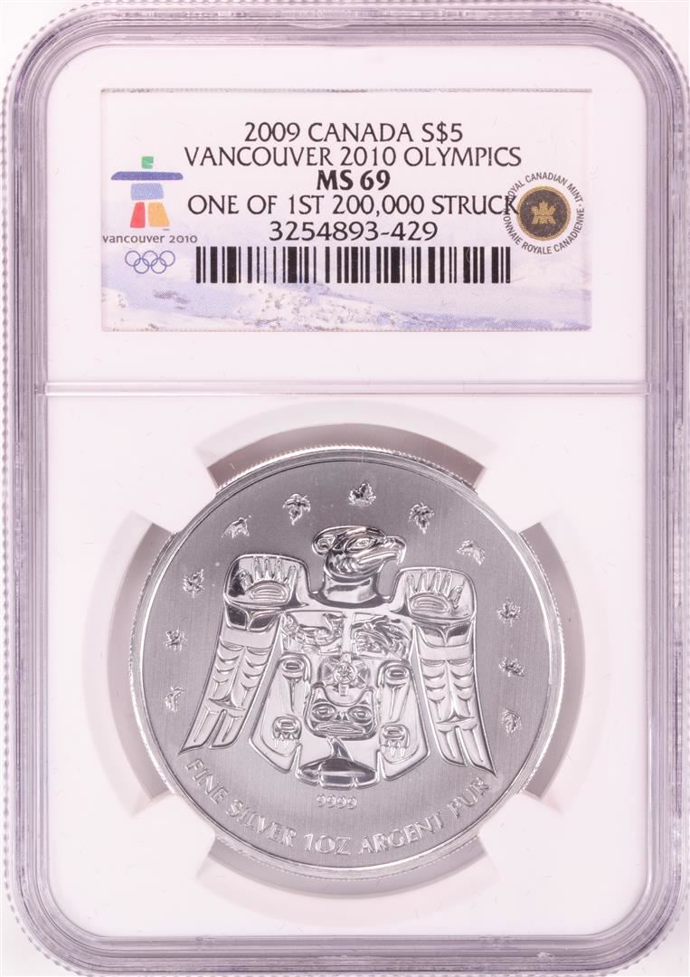 One 2009 Canada $5 Maple Leaf Vancouver Olympics Silver Coin NGC MS69. NGC Certified.