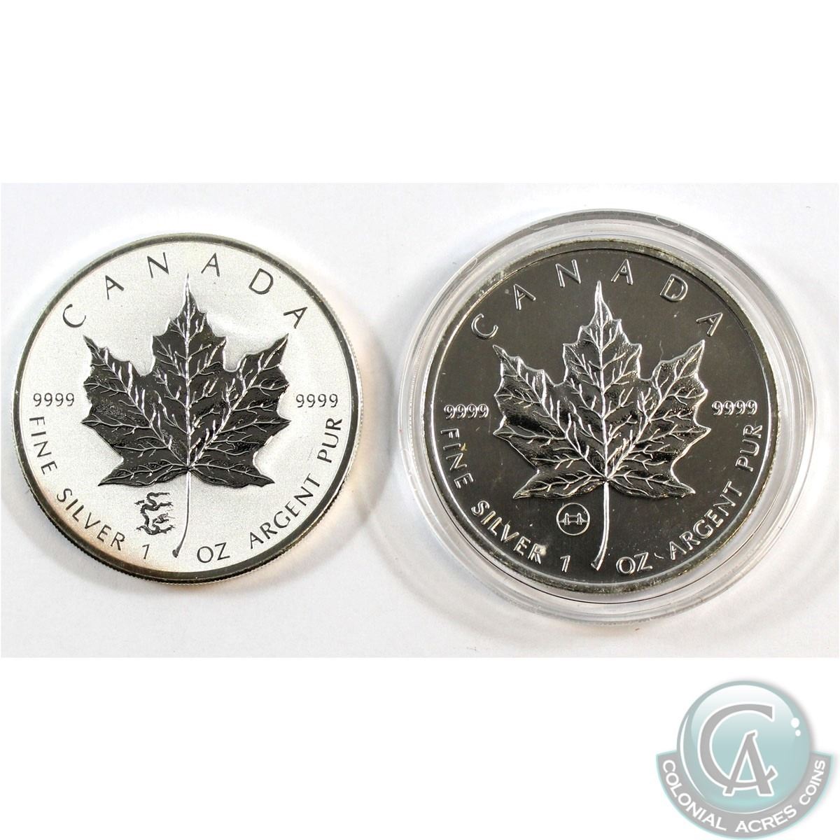 2009 Canada $5 Tower Bridge & 2012 Canada $5 Dragon Privy 1oz Fine Silver Maple Leafs (Tax Exempt). Please note coins have toning/spots. 2pcs