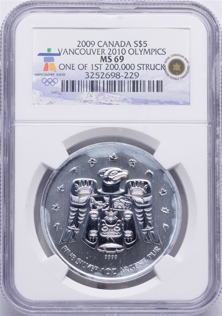 One 2009 Canada $5 Vancouver Olympics Silver Coin NGC MS69. NGC Certified.