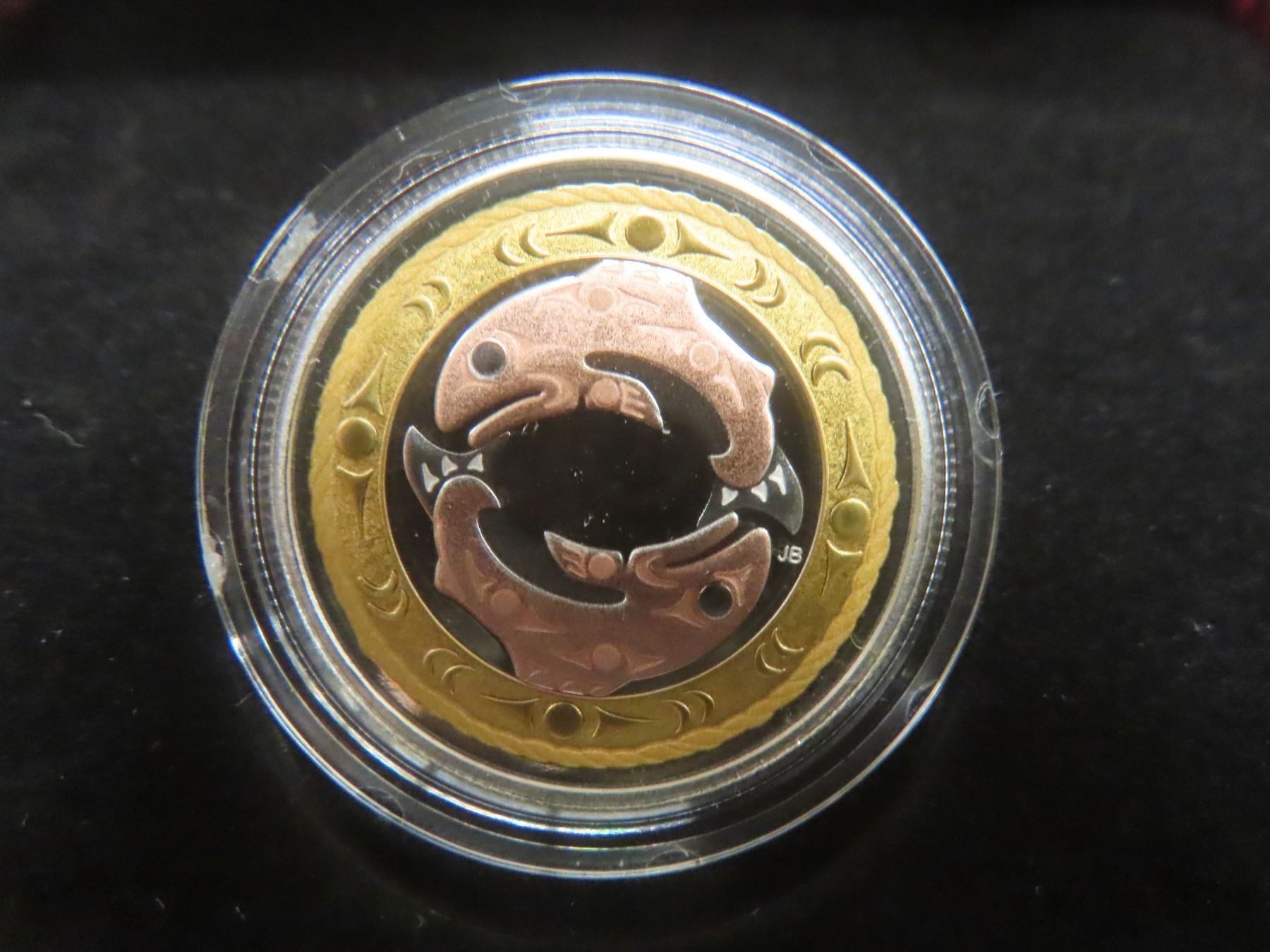 A beautifully crafted fine silver collector coin issued by the Royal Canadian Mint in 2010. This $3 coin features the “Return of the Tyee” design, showcasing two stylized salmon inspired by Indigenous artwork of the Pacific Northwest Coast. The design is by Coast Salish artist Jody Broomfield (initials “JB” visible on the coin).