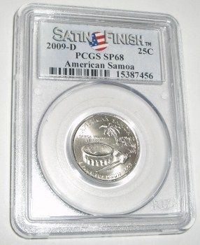 2009-D *AMERICAN SAMOA* Territory Quarter RED BOOK VALUE IS $40.00 *CERTIFIED BY PCGS SATIN FINISH SP68*!! ***Coin, Currency & All Items Listed in this auction - Grades, Conditions and Values are not Safe Deposit Coins LLC Responsibilty. Grades, Condition and Values are determined by Consigner(s) & Buyers ONLY***