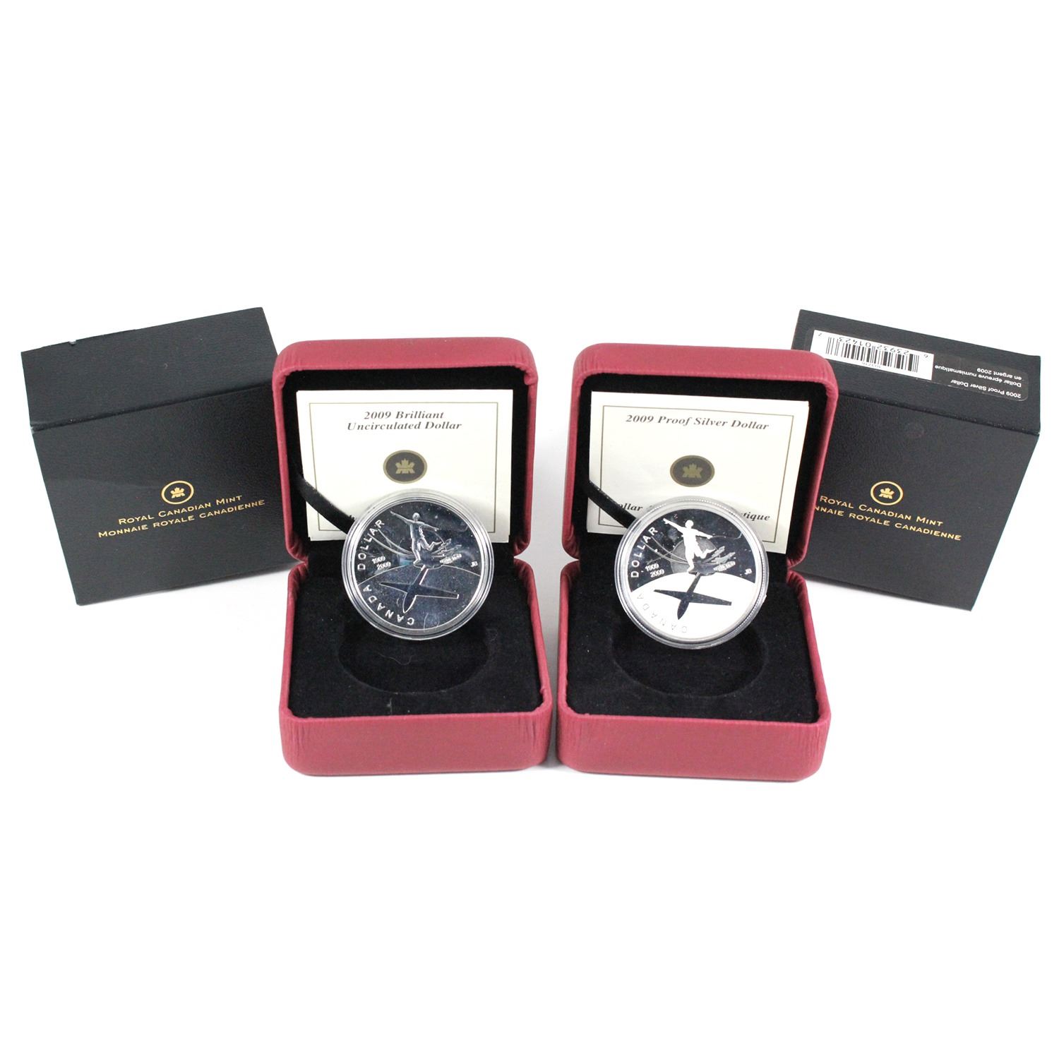 2009 Flight in Canada Centennial Brilliant Uncirculated & Proof Version Commemorative Sterling Silver Dollars (Coins lightly toned, capsules lightly scratched). 2pcs