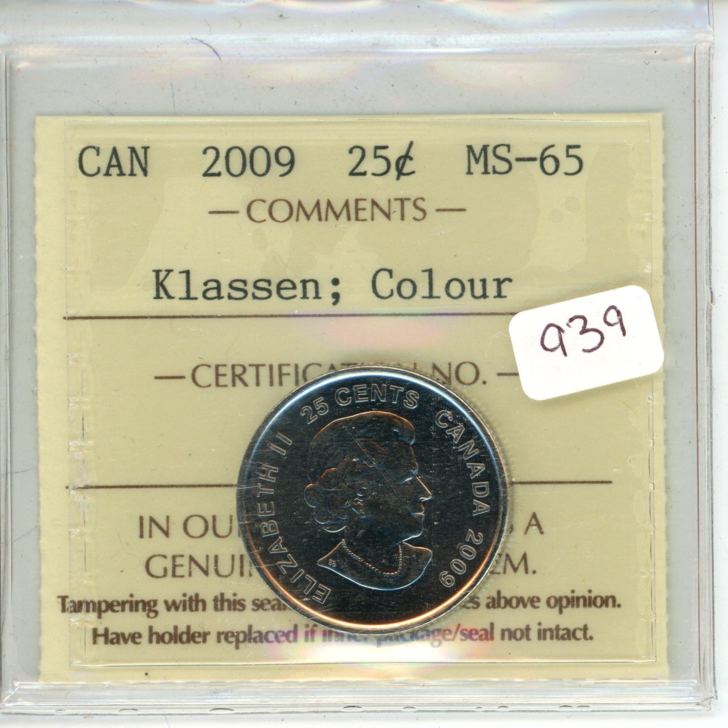 2009 Graded Canadian Quarter - MS-65: Klassen; Colour