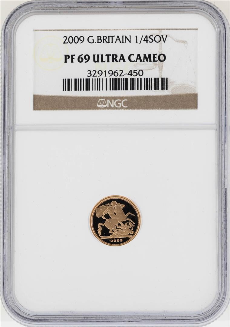 One 2009 Great Britain 1/4 Sovereign Gold Coin NGC PF69 Ultra Cameo. NGC Certified.