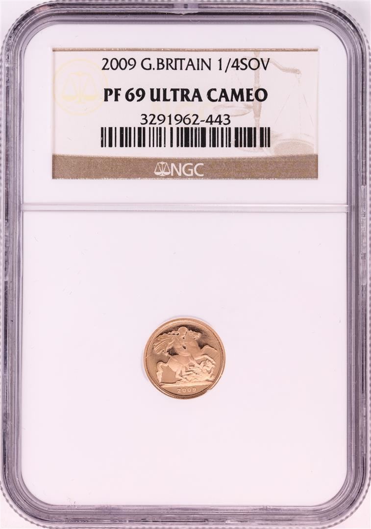One 2009 Great Britain 1/4 Sovereign Proof Gold Coin NGC PF69 Ultra Cameo. NGC Certified.