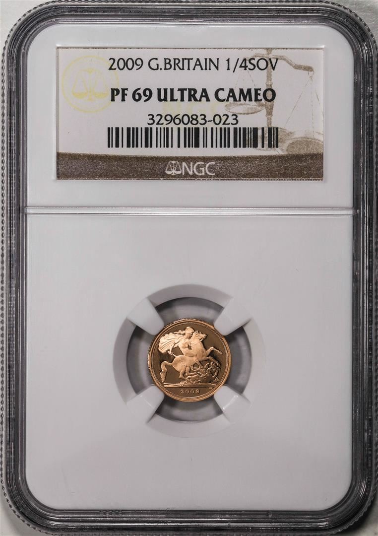 One 2009 Great Britain 1/4 Sovereign Proof Gold Coin NGC PF69 Ultra Cameo. NGC Certified.