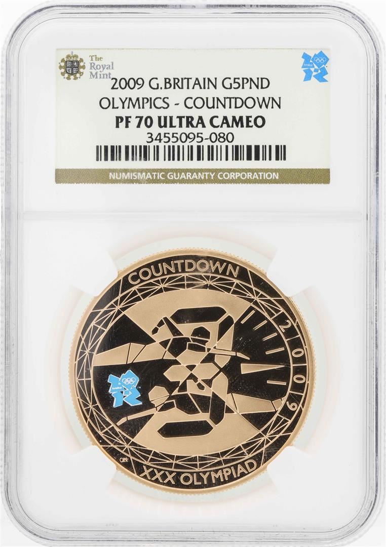 One 2009 Great Britain 5 Pound Olympics Countdown Gold Proof Coin NGC PF70 Ultra Cameo. NGC Certified.