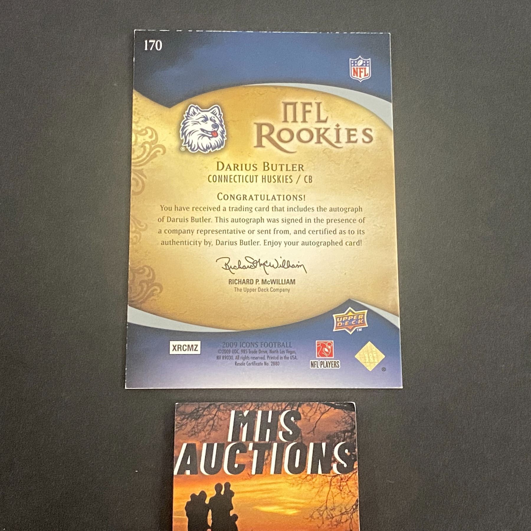 2009 ICONS FOOTBALL AUTOGRAPH DARIUS BUTLER HUSKIES #038/150 AUTOGRAPH CARD
