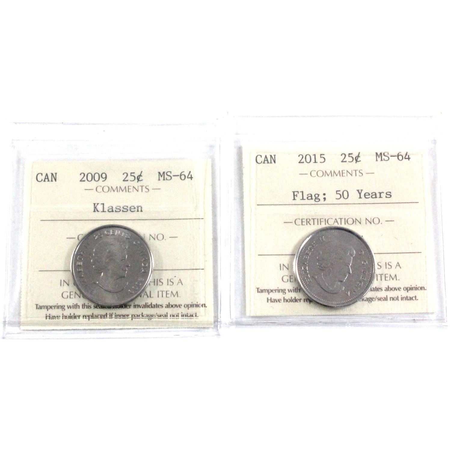 2009 Klassen &2015 Flag 25-cent ICCS Certified MS-64. 2pcs