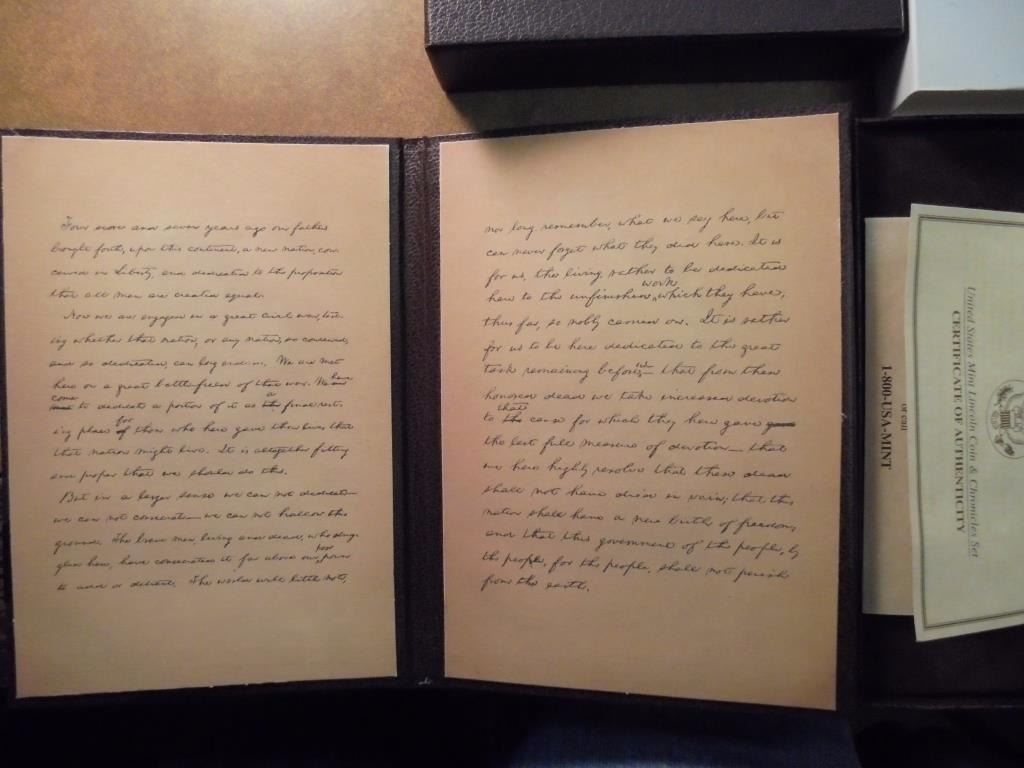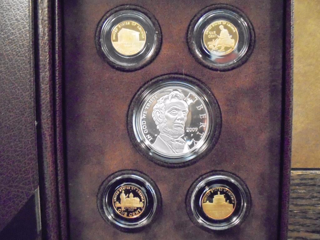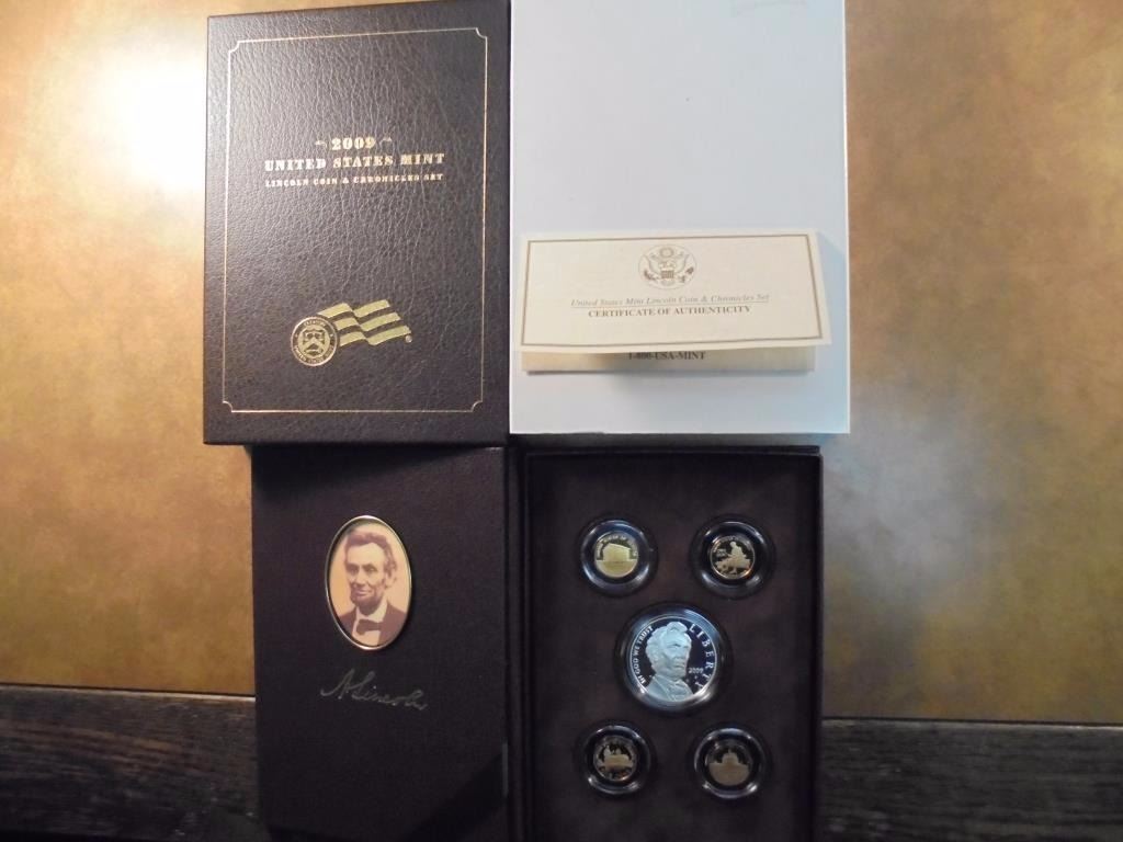 LINCOLN SILVER DOLLAR AND 4 PROOF LINCOLN CENTS, ORIGINAL US MINT PACKAGING