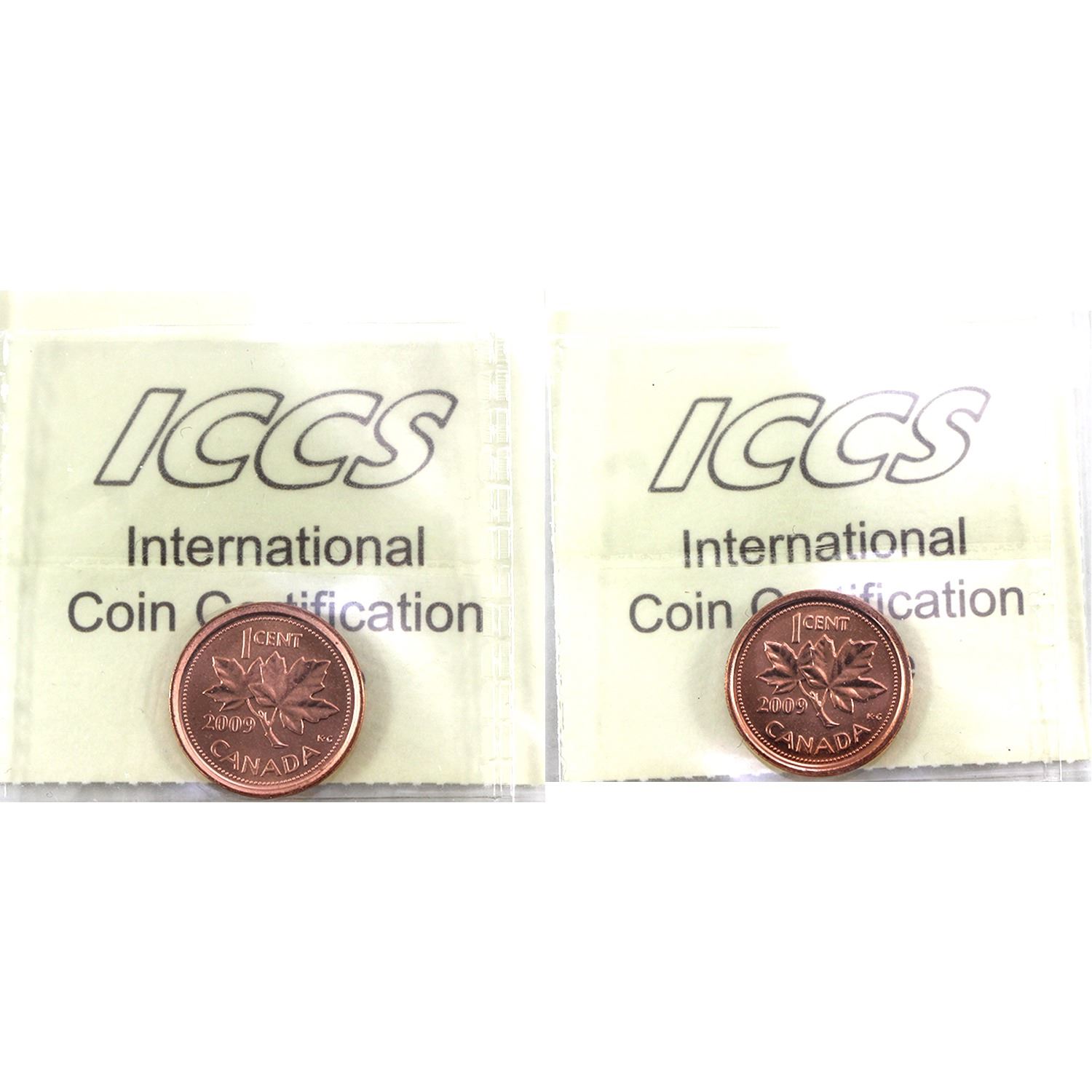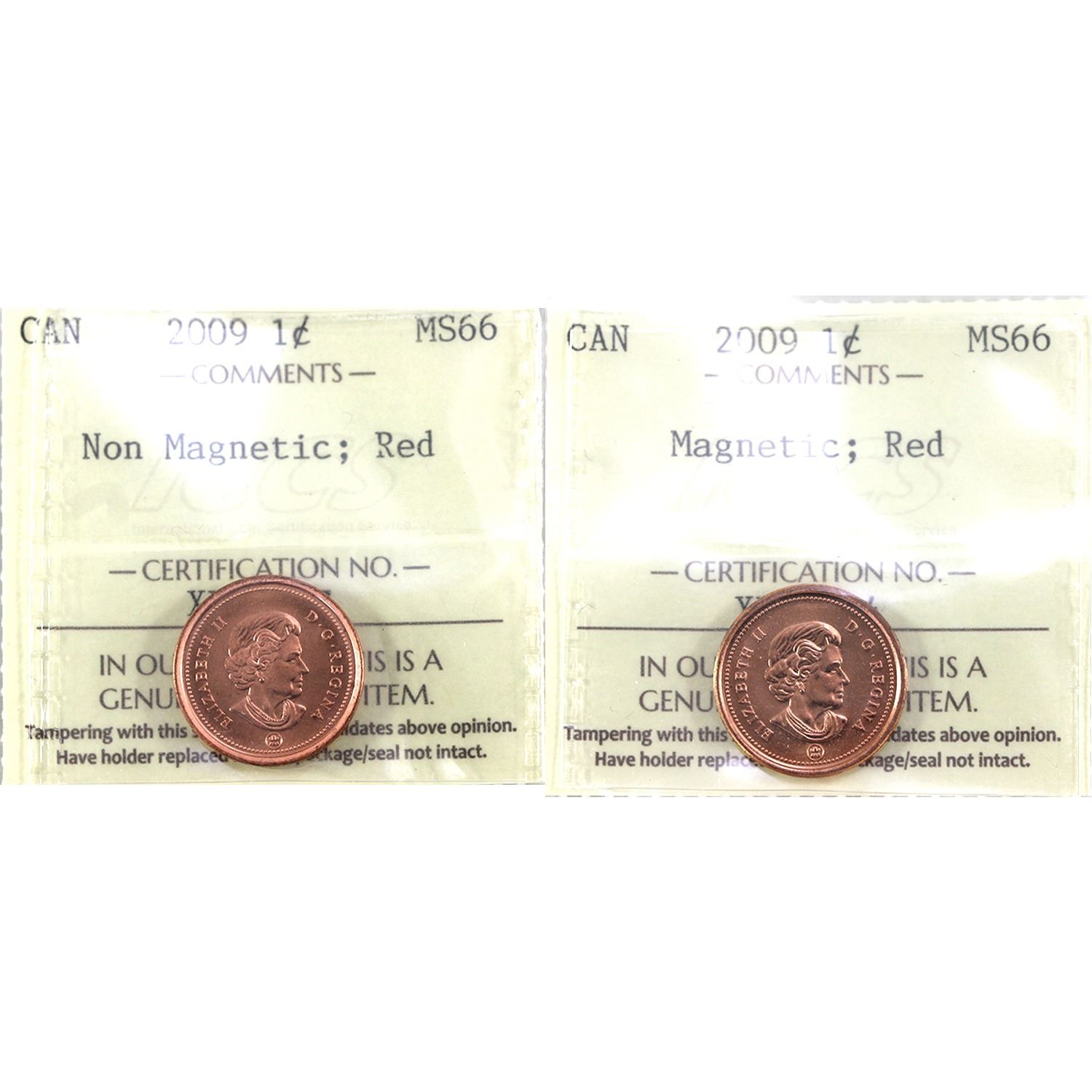 2009 Magnetic & Non-Magnetic Canada 1-cent ICCS MS66 Red. 2pcs