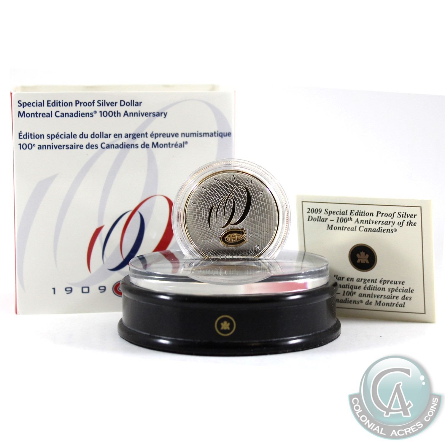 2009 Montreal Canadiens Special Edition Sterling Proof Dollar & Acrylic Stand. Coin contains faint toning.