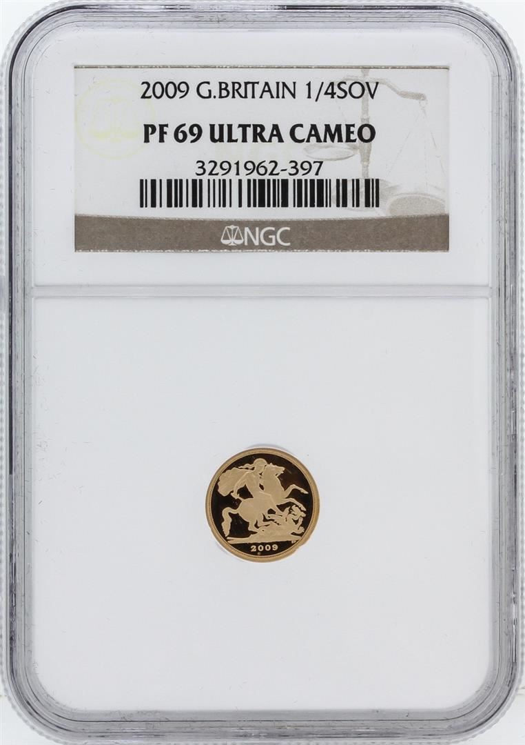 One 2009 NGC PF69 Ultra Cameo Great Britain 1/4 Sovereign Gold Coin. NGC Certified.