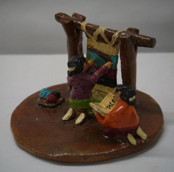 2009 Navajo Folk Art Pottery Weavers by Jonathan Chee, measures 3.5''H x 5.5''W, features 2 Navajo Weavers, one is weaving and the other is reading a book on Fairy Tales, nice bright colors, signed and dated on bottom by artist