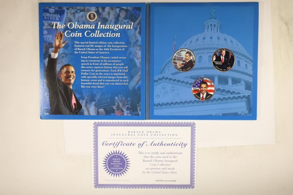 3 COLORIZED KENNEDY HALF DOLLARS, IN BLUE FOLIO CARD AND CERTIFICATE OF AUTHENTICITY BY THE US MINT