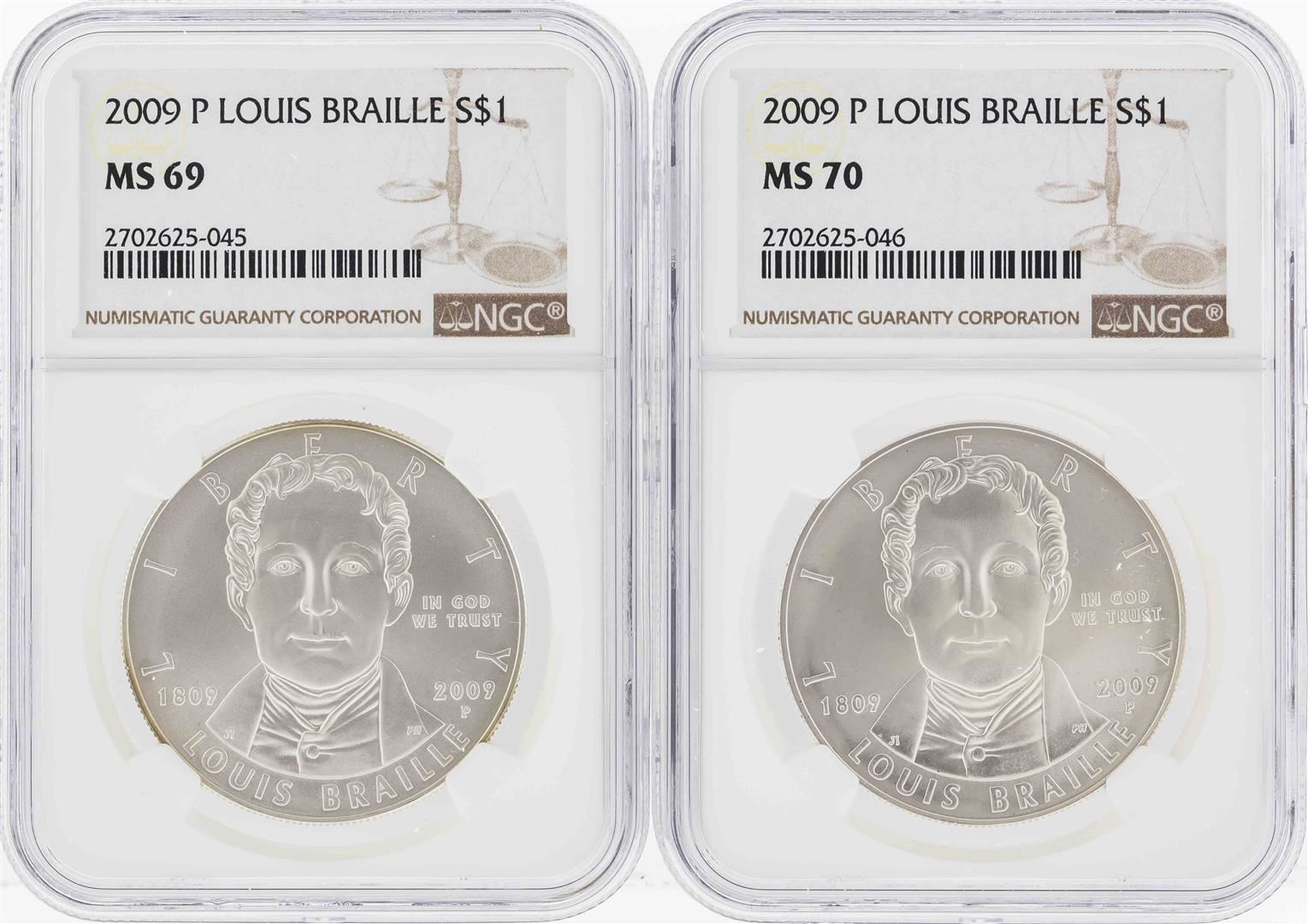 2009-P $1 Louis Braille Commemorative Silver Coins NGC MS69 & MS70