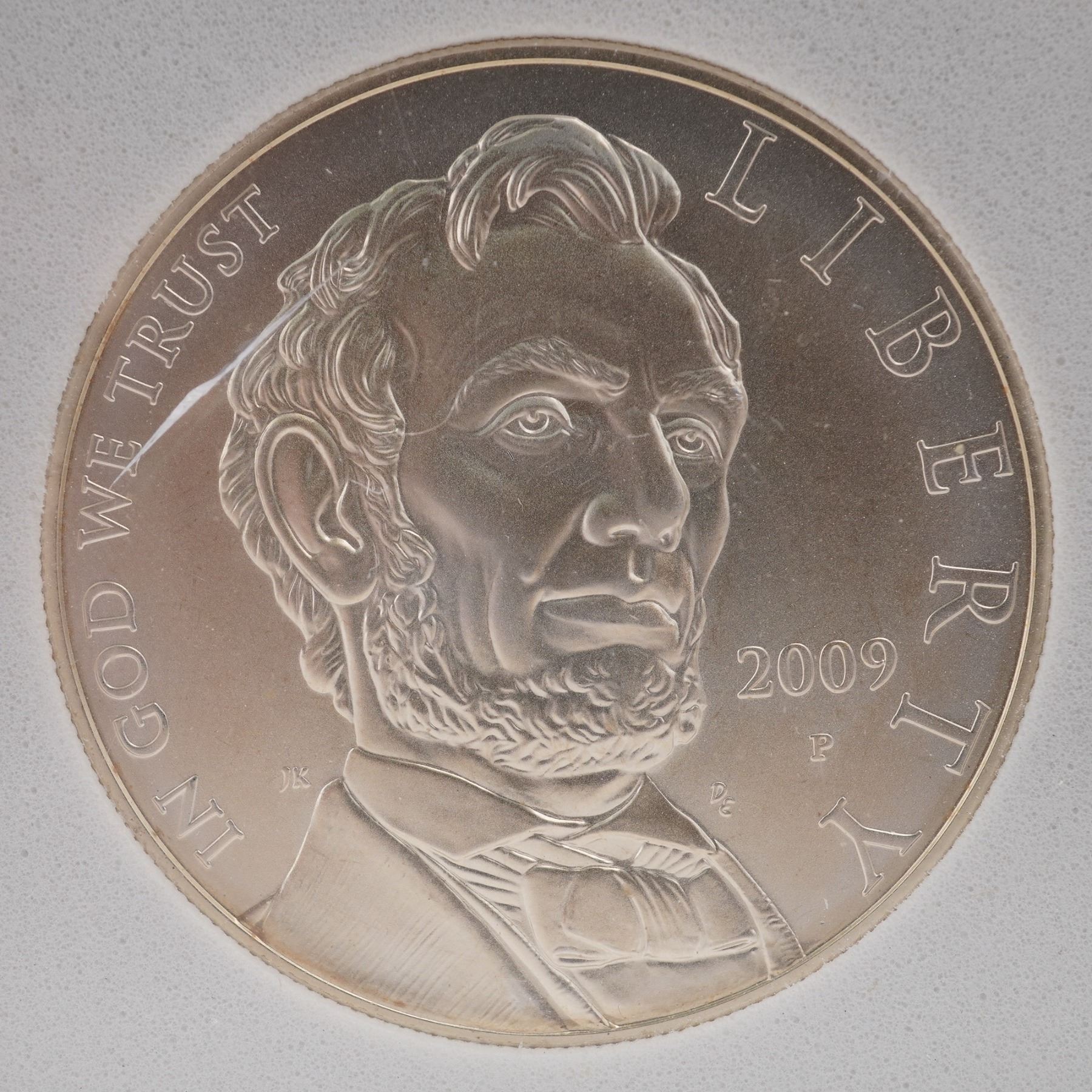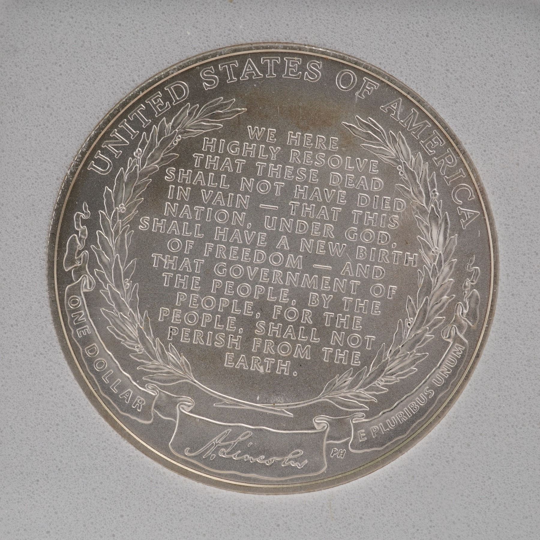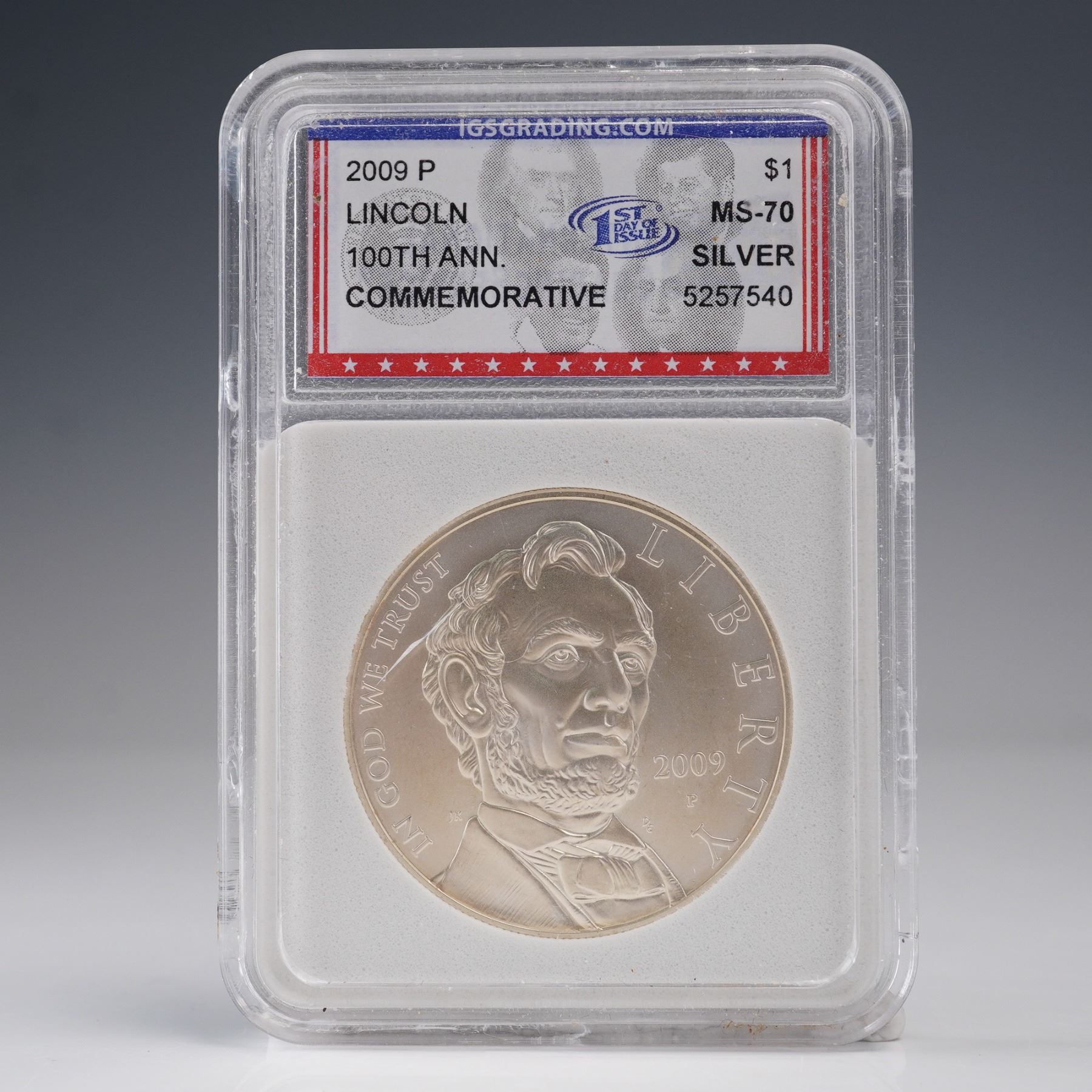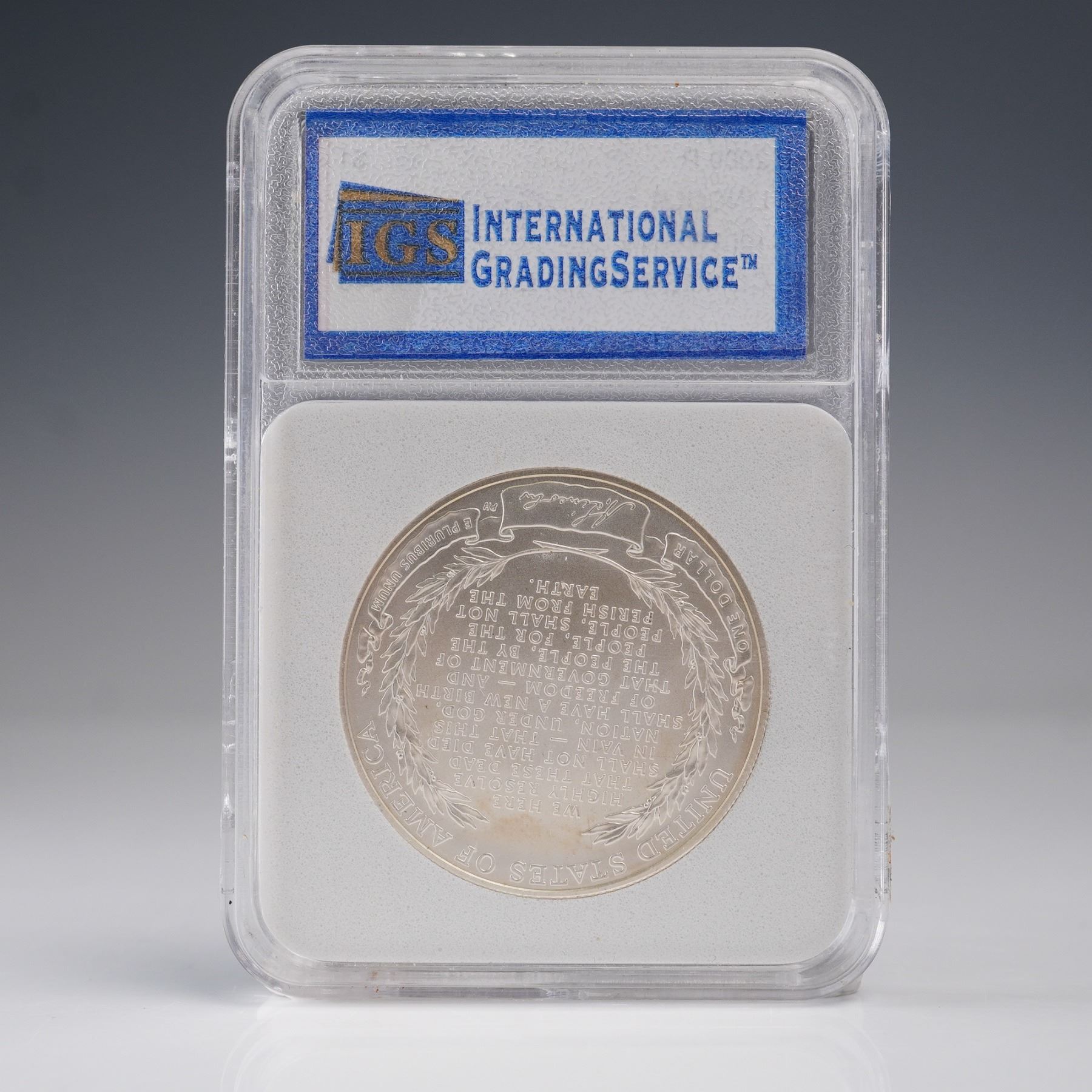 Struck in 2009 to honor the bicentennial of President Abraham Lincoln's birth, this Philadelphia minted silver dollar, graded MS-70 by the International Grading Service (IGS). The silver dollar bears the iconic portrait of Lincoln facing right, inscribed with the motto "IN GOD WE TRUST" and the word "LIBERTY," along with the date and mint mark. Issued as part of a commemorative series, the reverse design features an excerpt from the Gettysburg Address; encircled by a laurel wreath-and engraved with Lincoln's signature, reaffirming his enduring legacy in American history. Housed in an IGS authenticated slab for further preservation. Slab measures: 2.25"L x 0.25"W x 3.25"H.