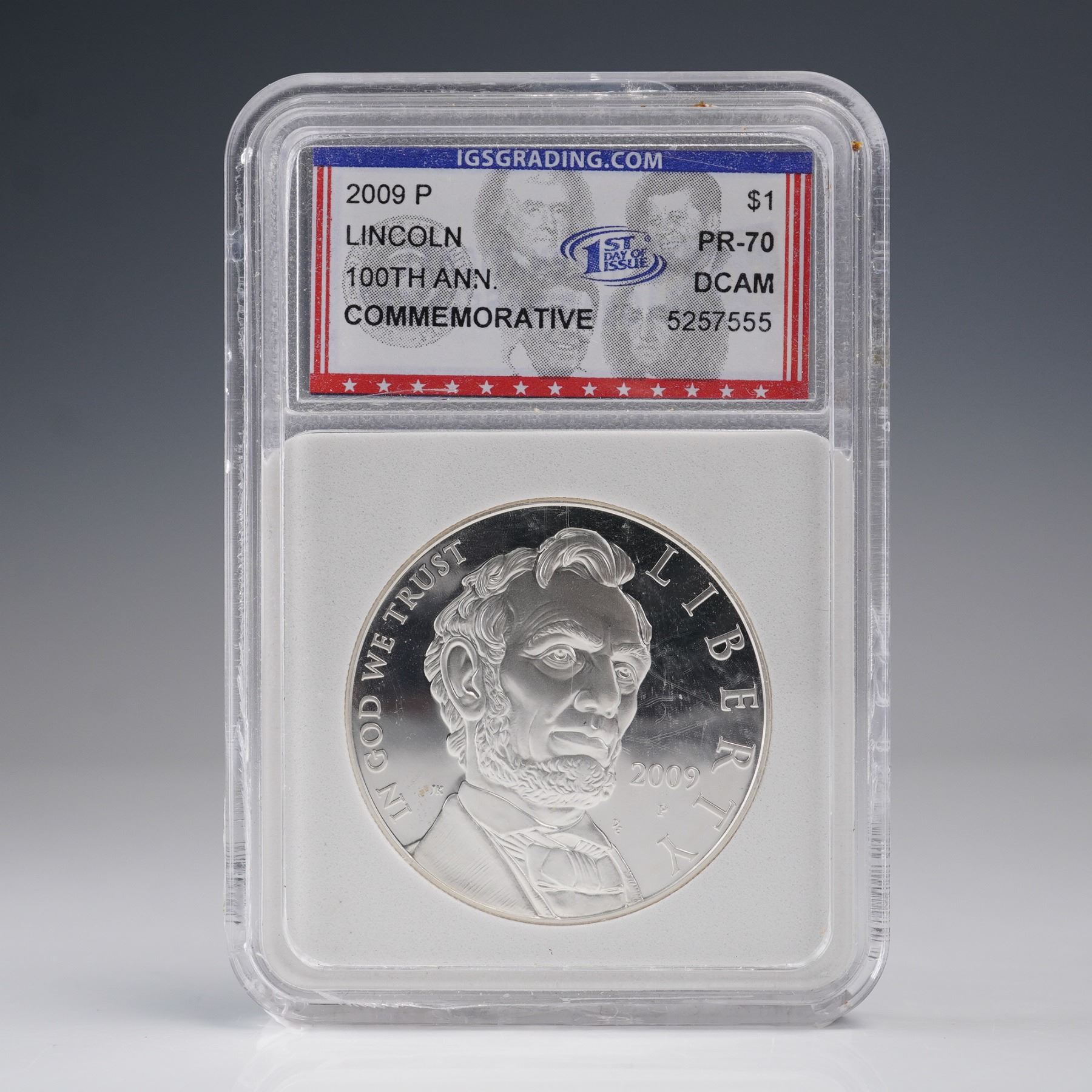 Struck in celebration of the 100th anniversary of Abraham Lincoln's birth, this 2009 P Lincoln Commemorative Silver Dollar is rendered in stunning deep cameo proof with a flawless PR70 designation by IGS. Composed of one ounce of .999 fine silver. The obverse displays a powerful portrait of President Lincoln facing forward, engraved with the inscriptions "LIBERTY," "IN GOD WE TRUST," and the year "2009." The reverse is intricately detailed with a laurel wreath encircling an excerpt from the Gettysburg Address, emphasizing Lincoln's enduring legacy and his vision for a government "of the people, by the people, for the people." Housed in an IGC authenticated slab for further protection. Slab measures: 2.25"L x 0.25"W x 3.25"H.