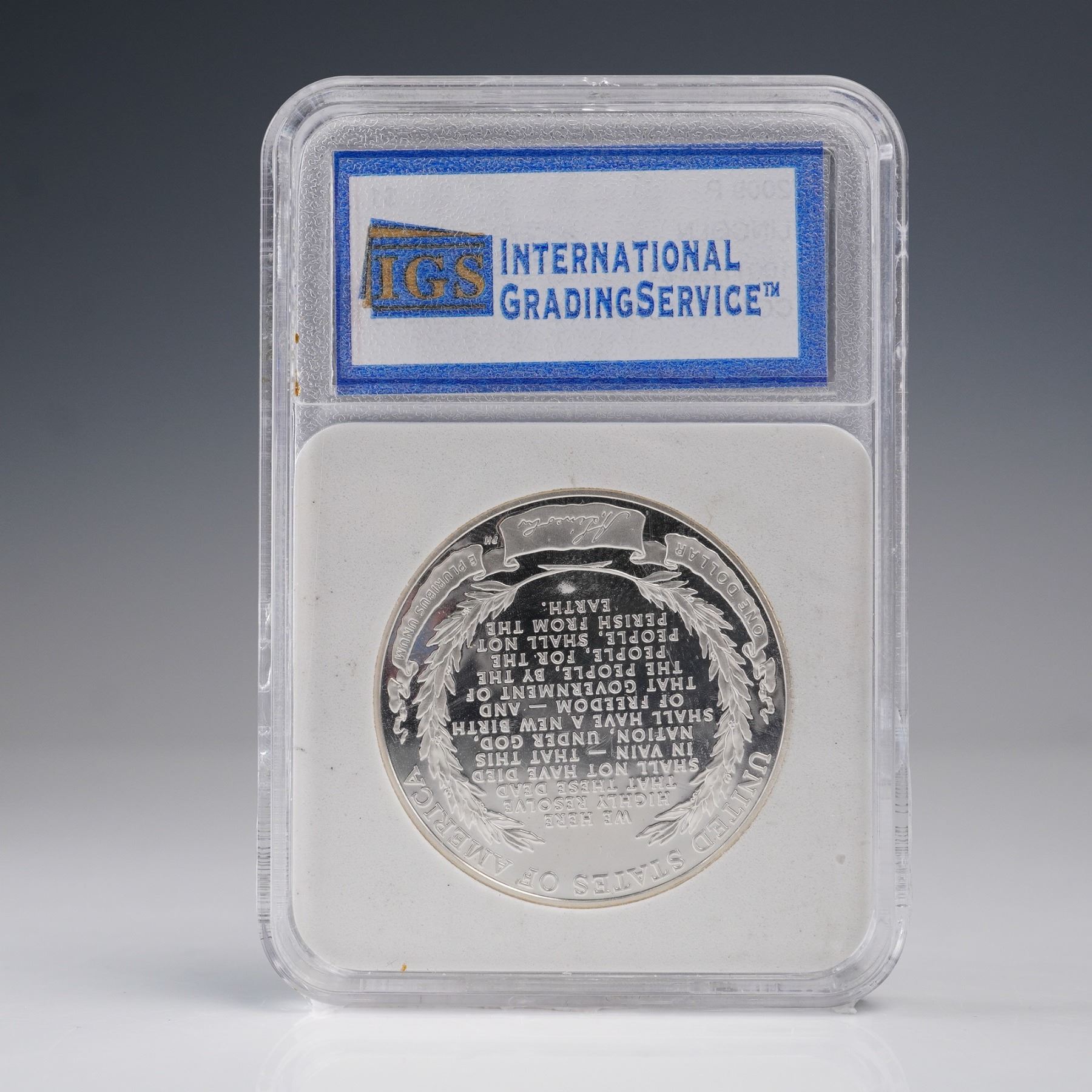 Struck in celebration of the 100th anniversary of Abraham Lincoln's birth, this 2009 P Lincoln Commemorative Silver Dollar is rendered in stunning deep cameo proof with a flawless PR70 designation by IGS. Composed of one ounce of .999 fine silver. The obverse displays a powerful portrait of President Lincoln facing forward, engraved with the inscriptions "LIBERTY," "IN GOD WE TRUST," and the year "2009." The reverse is intricately detailed with a laurel wreath encircling an excerpt from the Gettysburg Address, emphasizing Lincoln's enduring legacy and his vision for a government "of the people, by the people, for the people." Housed in an IGC authenticated slab for further protection. Slab measures: 2.25"L x 0.25"W x 3.25"H.