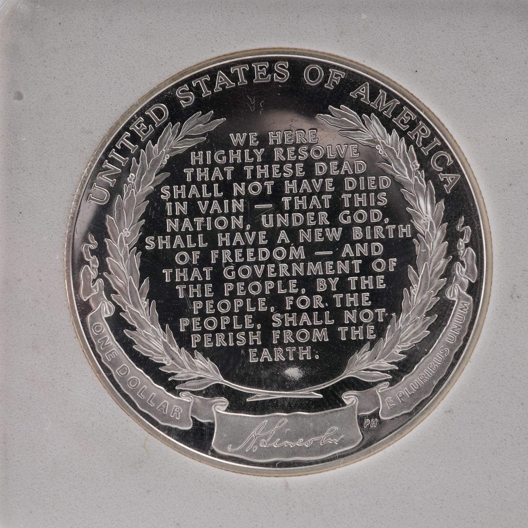 Struck in celebration of the 100th anniversary of Abraham Lincoln's birth, this 2009 P Lincoln Commemorative Silver Dollar is rendered in stunning deep cameo proof with a flawless PR70 designation by IGS. Composed of one ounce of .999 fine silver. The obverse displays a powerful portrait of President Lincoln facing forward, engraved with the inscriptions "LIBERTY," "IN GOD WE TRUST," and the year "2009." The reverse is intricately detailed with a laurel wreath encircling an excerpt from the Gettysburg Address, emphasizing Lincoln's enduring legacy and his vision for a government "of the people, by the people, for the people." Housed in an IGC authenticated slab for further protection. Slab measures: 2.25"L x 0.25"W x 3.25"H.