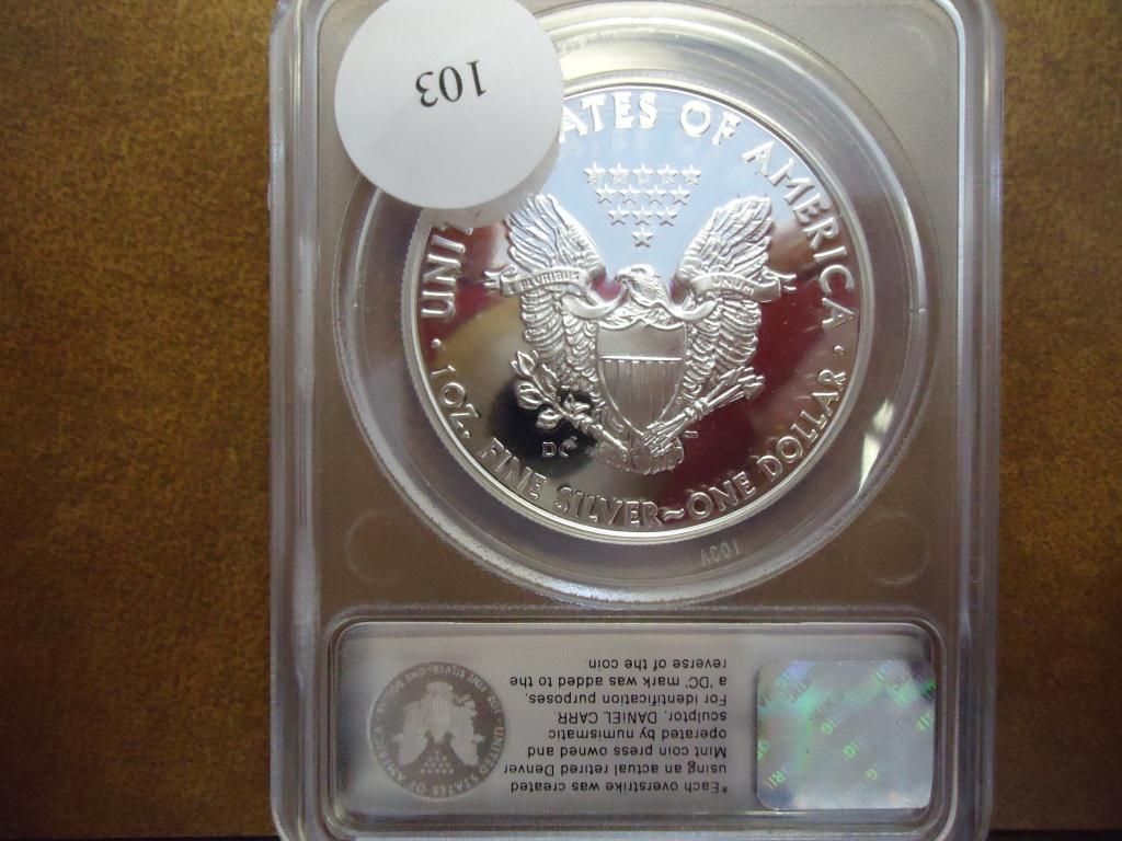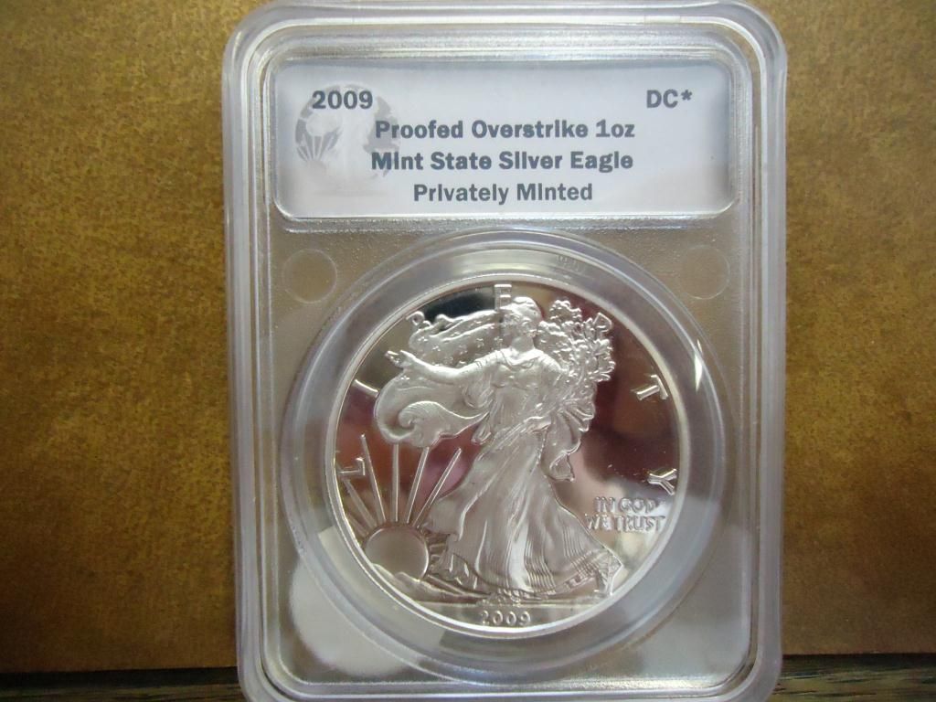 THE US MINT DID NOT PRODUCE PF SILVER EAGLES DATED 2009, SO DANIEL CARR, A PRIVATE MINTER, OVERSTRUCK 2009 DATED SILVER EAGLES PRODUCING OF PROOF FINISH. EACH COIN BEARS THE LETTERS DC IN PLACE OF A MINT MARK