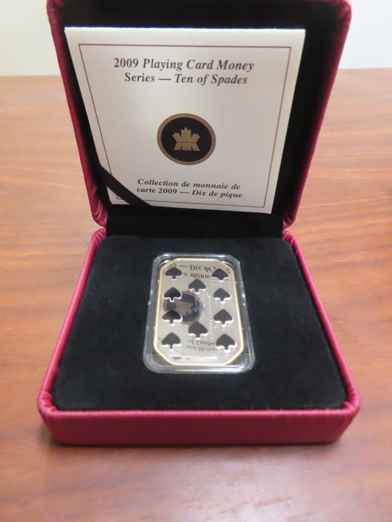2009 Playing Card Money Ten of Spades $15. Coloured. Sterling Silver. Proof with Ultra Heavy Cameo. Housed in its original Royal Canadian Mint case & box of issue. Includes Certificate of Authenticity.