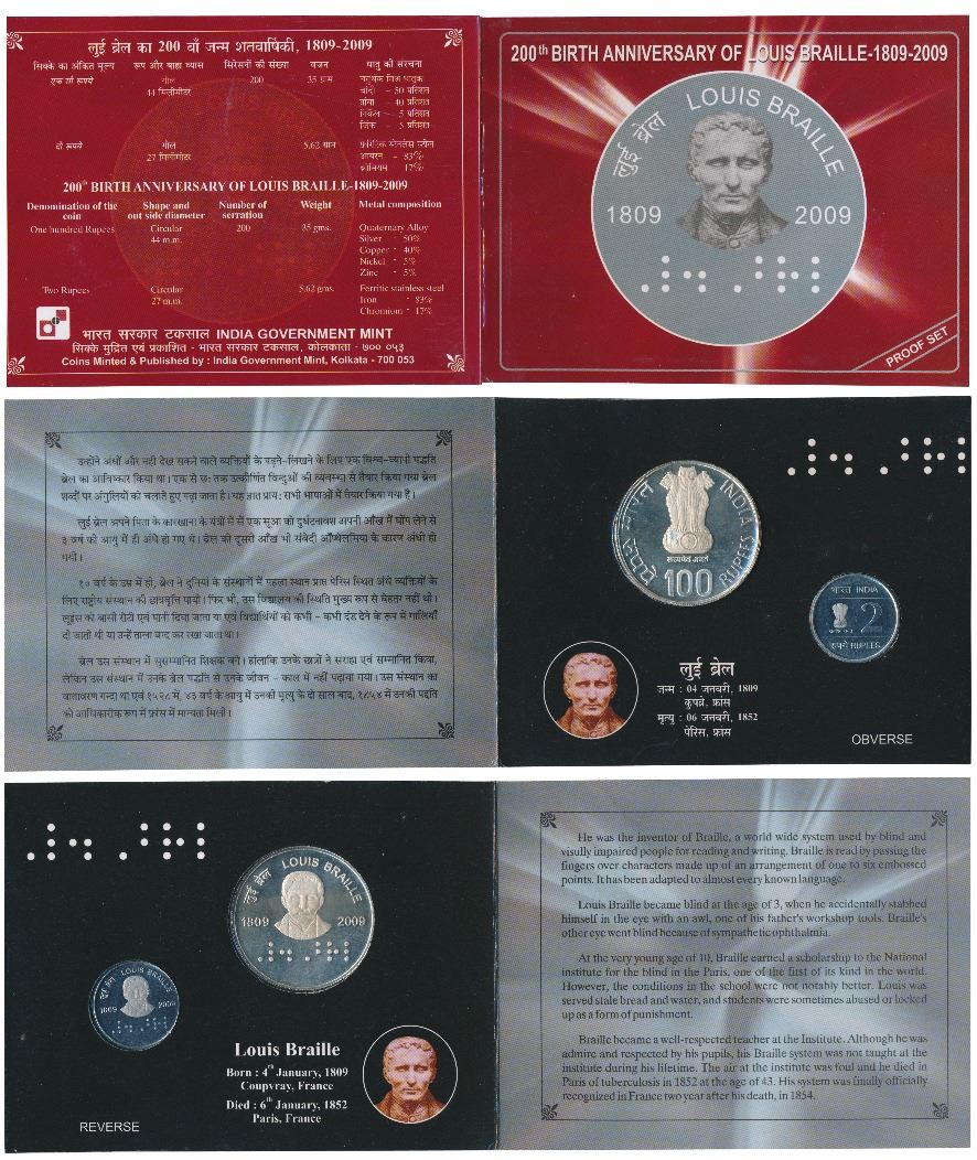 2009 Proof Set, 200th Birth Anniversary of Louis Braille, set of 2, Rupees 2 and 100. In immaculate condition, within original packaging. (2)