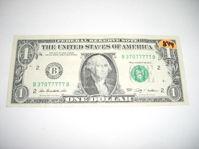 2009 SERIES EXTRA RARE *SAME 6 DIGITS SERIAL DIGITS* $1.00 SERIAL # *B37077777B. NICE US DOLLAR*!! DOLLAR CAME OUT OF SAFE!! ***Coin, Currency & All Items Listed in this auction - Grades, Conditions and Values are not Safe Deposit Coins LLC Responsibilty. Grades, Condition and Values are determined by Consigner(s) & Buyers ONLY