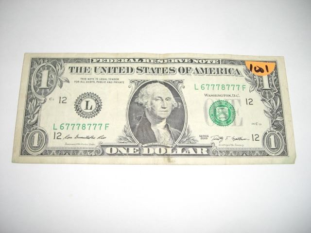 2009 SERIES EXTRA RARE *SAME 6 DIGITS SERIAL DIGITS* $1.00 SERIAL # *L67778777F. NICE US DOLLAR*!! DOLLAR CAME OUT OF SAFE!! ***Coin, Currency & All Items Listed in this auction - Grades, Conditions and Values are not Safe Deposit Coins LLC Responsibilty. Grades, Condition and Values are determined by Consigner(s) & Buyers ONLY