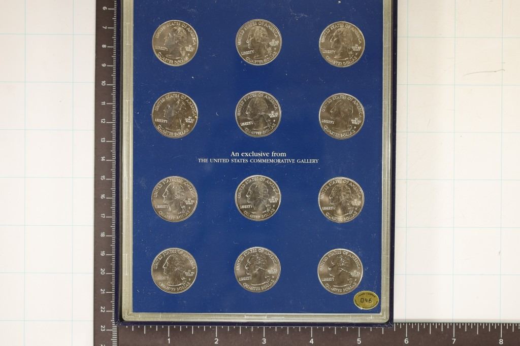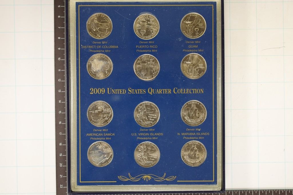 UNC QUARTERS IN PLASTIC CASE HOUSED IN A BLUE CLAMSHELL BOX. THESE ARE THE US TERRITORIES