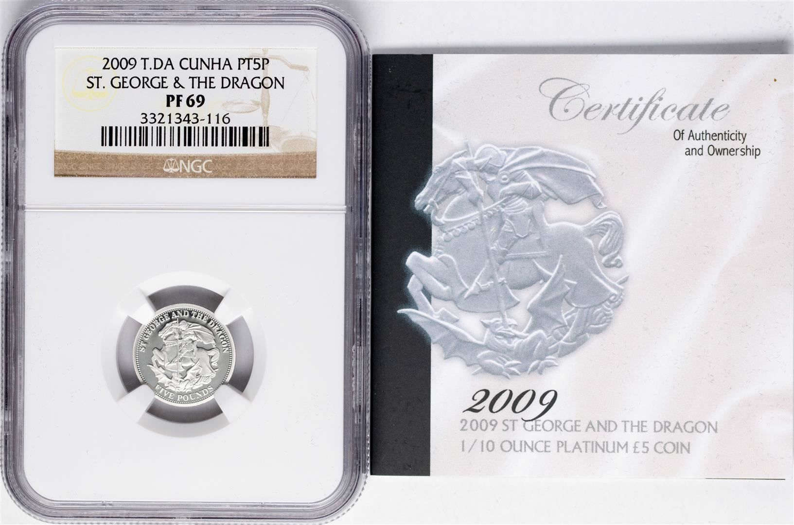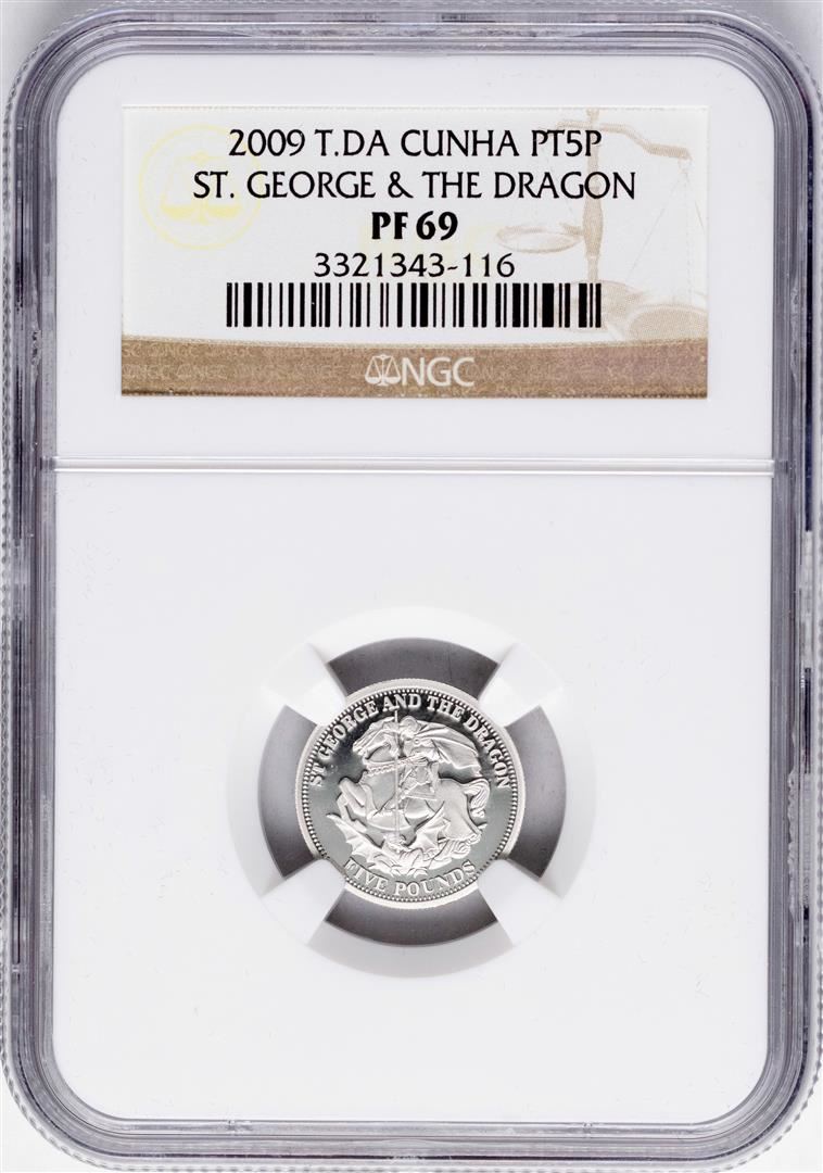 One 2009 T.DA Cunha 5 Pounds 1/10 oz St. George & Dragon Platinum Coin NGC PF69. NGC Certified.